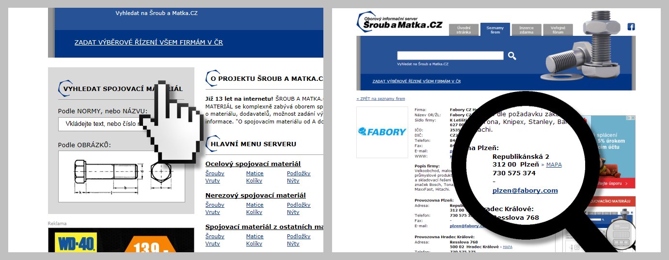 PřílohaVyzkoušejte si 2 novinky na našem národním serveru. Nadpisu VYHLEDAT SPOJOVACÍ MATERIÁL na úvodní stránce jsme na základě vašich četných žádostí přidali odkaz. Do této sekce se tak nyní můžete dostat rychleji a bez nutnosti vyplňovat údaje o hledaném spojovacím materiálu. Vyzkoušejte. V sekci SEZNAMY FIREM naleznete u každé registrované firmy i seznam poboček v ČR. Nově jsme ke každé pobočce přidali i automaticky generovaný odkaz na MAPU. Vyzkoušejte. Těšíme se na další vaše nápady...
